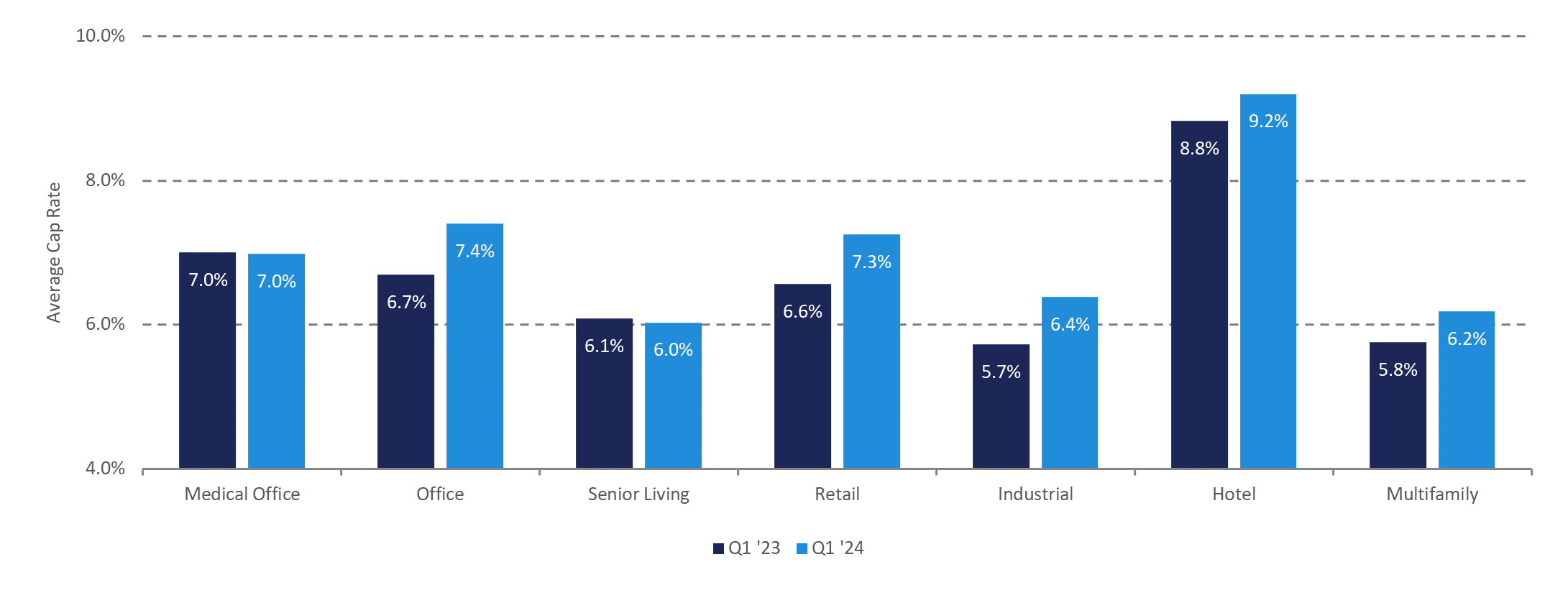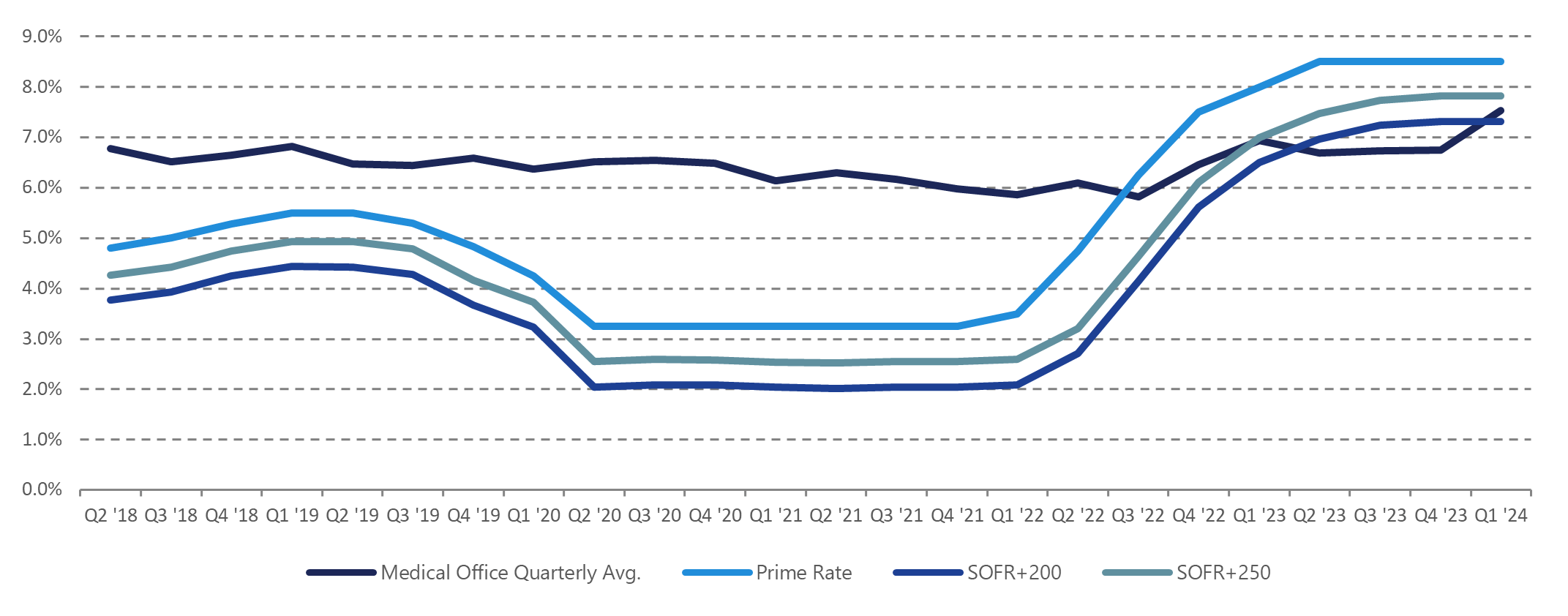 Despite holding steady throughout the previous two quarters, cap rates ticked upwards over the first three months of 2024 reaching 7.0-percent, the same quarterly average seen in the first quarter of 2023. As most other asset classes saw an increase in average cap rates year-over-year, medical outpatient buildings stabilized valuation metrics further highlight the strength of the asset’s underlying fundamentals. Steady cap rates coupled with decreased sales volume indicate that the sector’s reduced transaction activity can be primarily attributed to the stubborn state of debt capital markets.