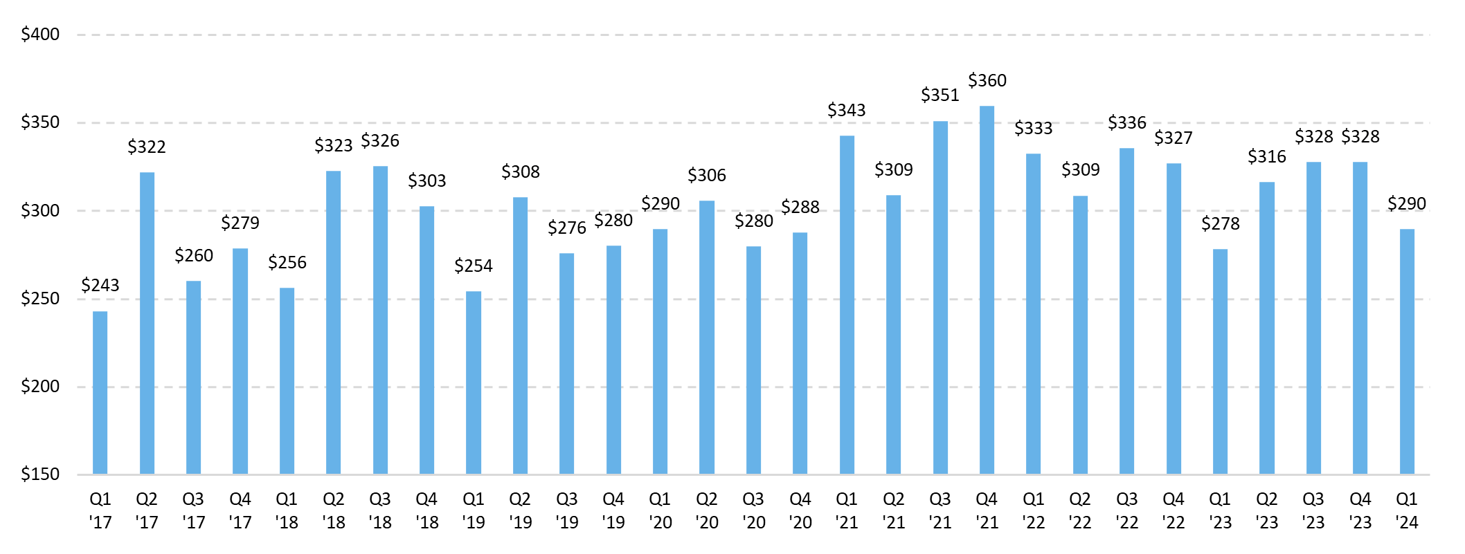 The average price per square foot for the first quarter equated to $290/SF. This figure represents almost a 12% decline compared to the previous two quarters. However, while declining compared to the last two quarters, the metric sits about 4% higher compared to the first quarter in 2023, further illustrating resilient valuations year-over year.