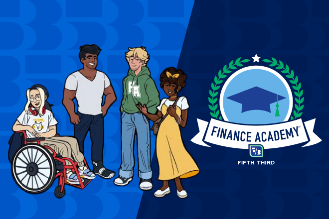 Our Fifth Third Bank Finance Academy® includes courses on foundational personal finance and entrepreneurship. The program is available to students in junior high school as well as high school, enabling Fifth Third to offer a continuum of learning in personal finance from grade school with Young Bankers Club to junior high to high school with Finance Academy.